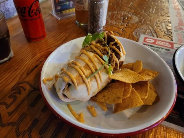 • A burrito – With your choice of protein – pulled beef, chipotle chicken, BBQ Pork, Prawn, Bean & Cheese